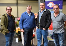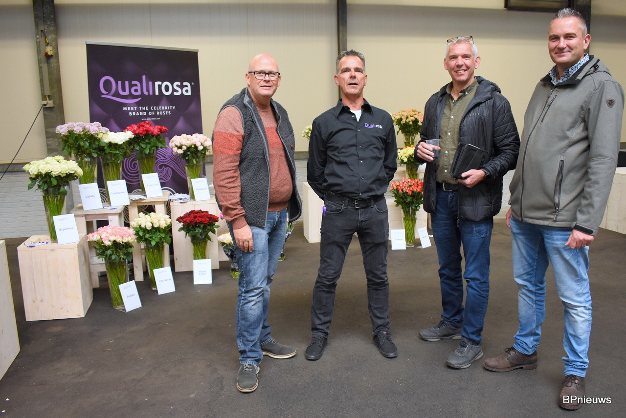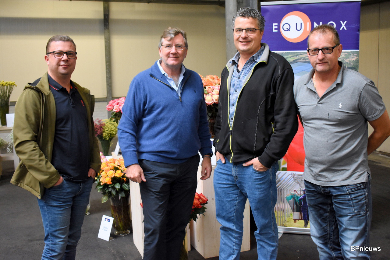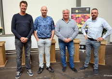 Alexander van Egmond van W.K. Heyl, eigenaar van Equinox, Rod Jones, veilingmeester rozen in Rijnsburg, en Ruud van der Hout en Jaap Shneijer van Flower Business Support.