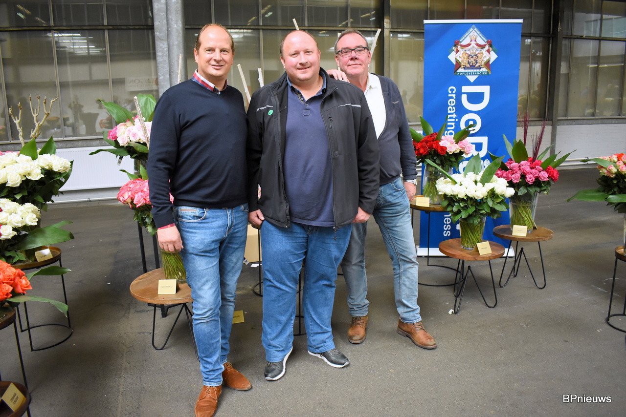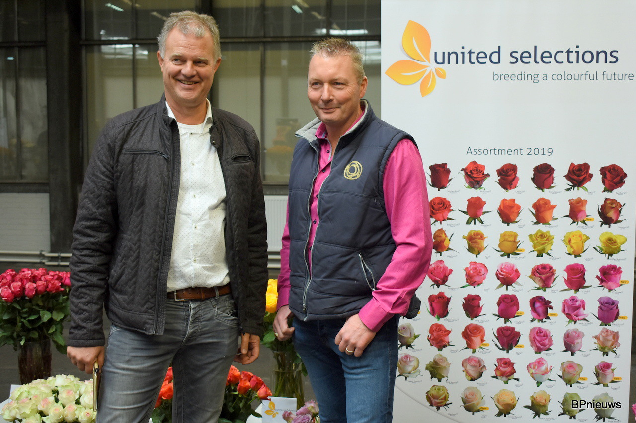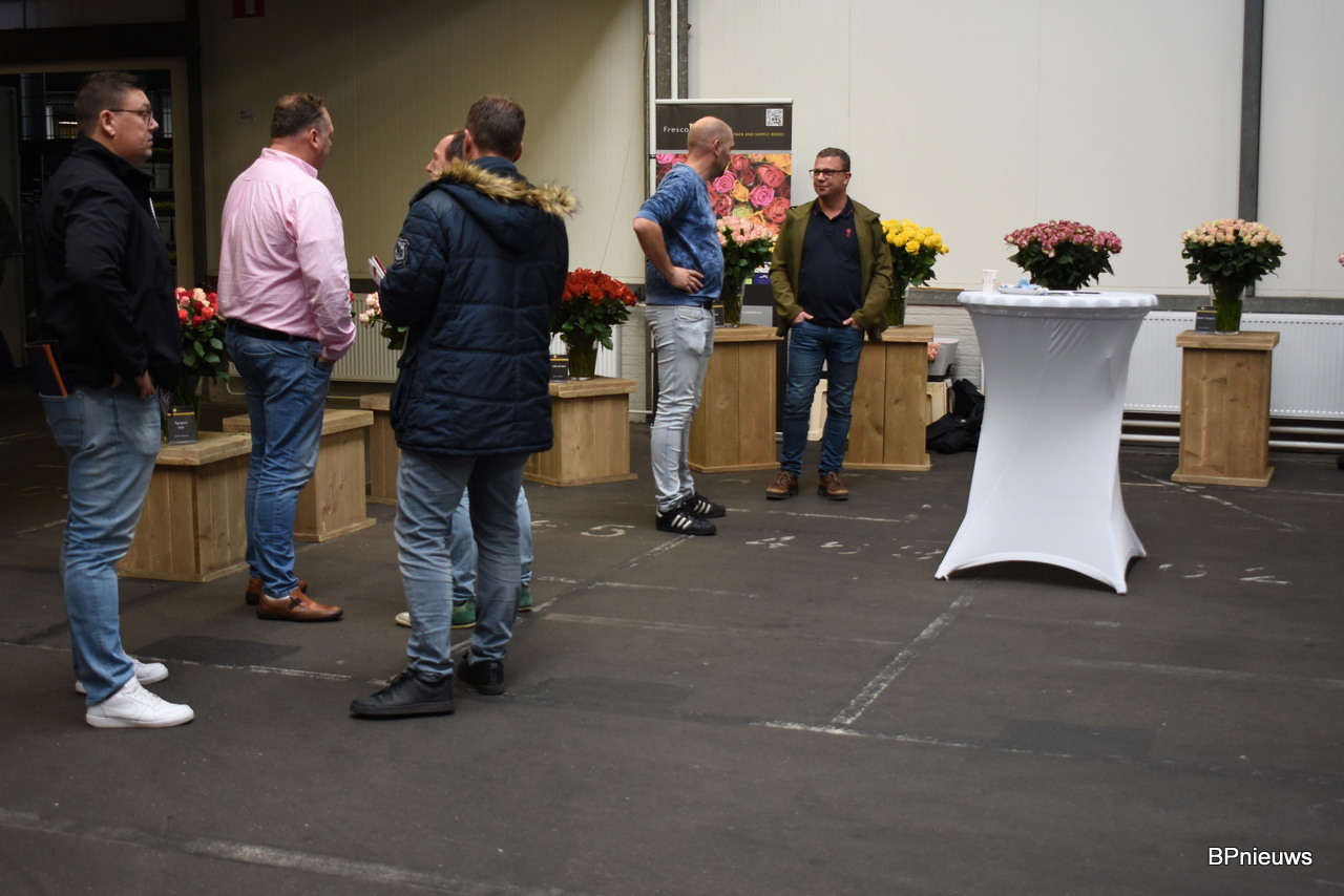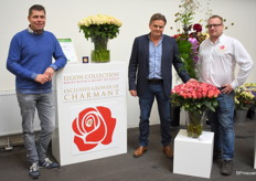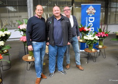 De mannen van De Ruiter Örjan Hulshof en Walter Kammeraad met in het midden Wim Hendrikse van Rosalink. Örjan hoopte hier vooral de lijnrijders te spreken. Goede houdbaarheid, niet te lange stelen, goede transport eigenschappen en een mooi uniform product is daarom belangrijk.