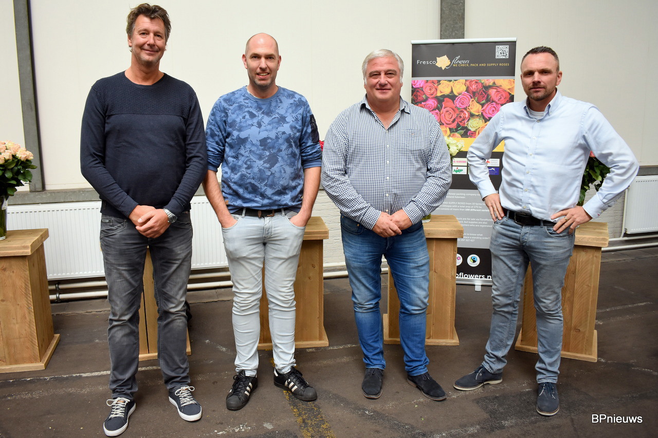 De mannen van Fresco Flowers mochten natuurlijk, als een van de grootste rozen verwerkers, niet ontbreken. Van links naar recht; Jan, Jos, Gerjan en Aart.