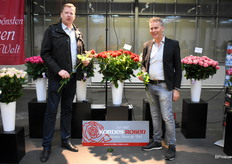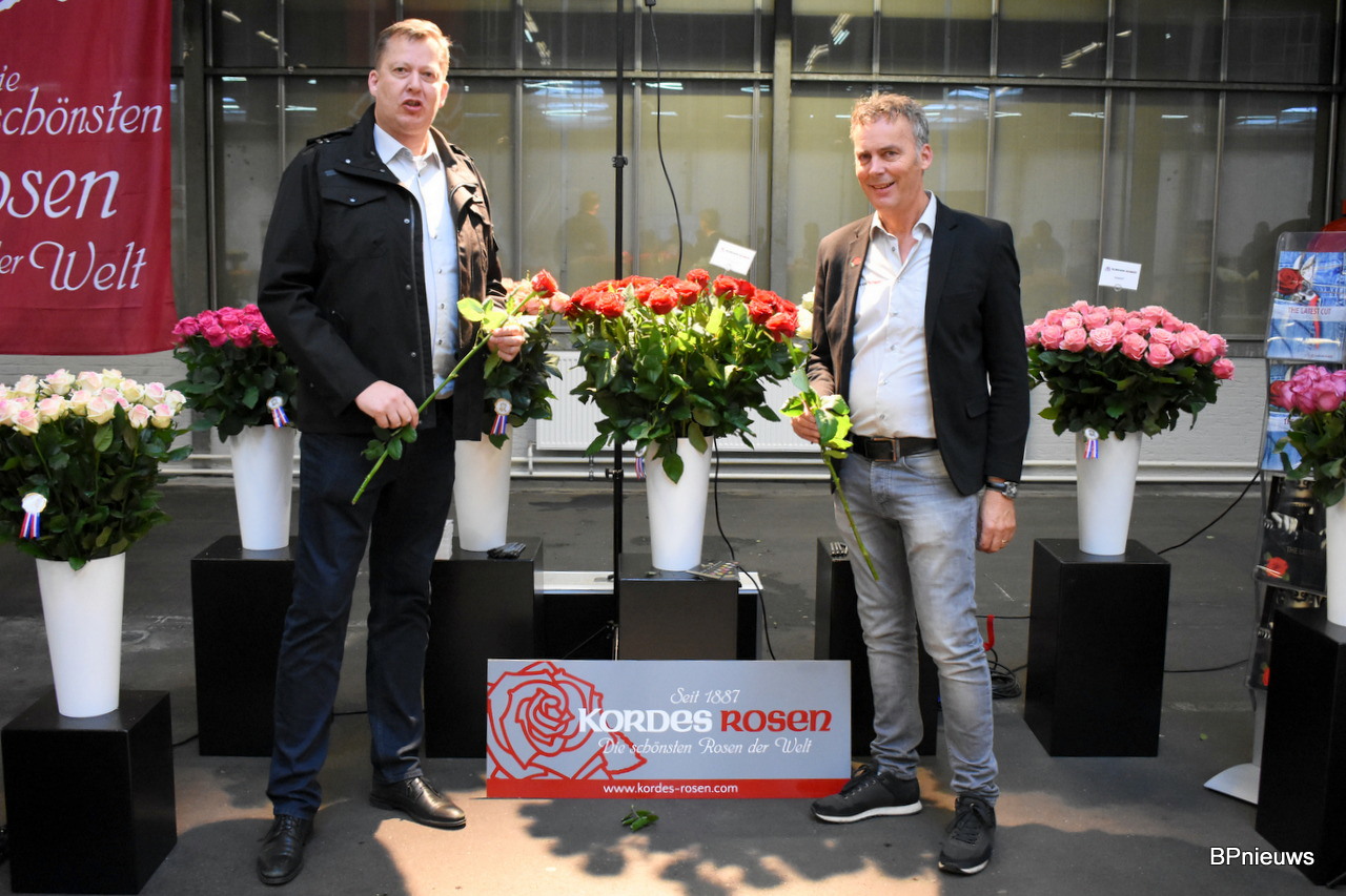 Göran Basjes en Ad Volkering van Kordes Roses. Ad vertelde dat er vandaag extra aandacht is voor de kersverse soorten in de markt zoals de Apricola en Con Amore. Dit zijn de Nederlandse rozen uit hun assortiment.