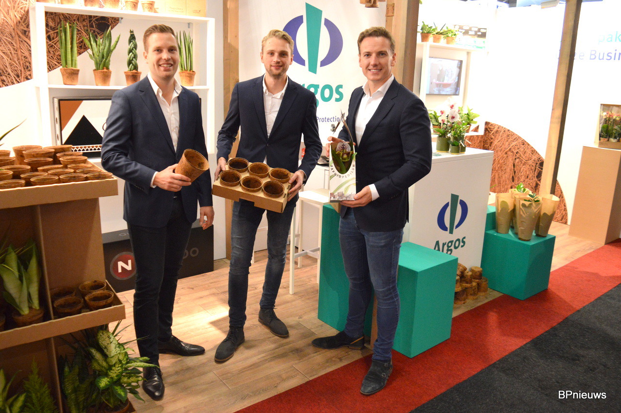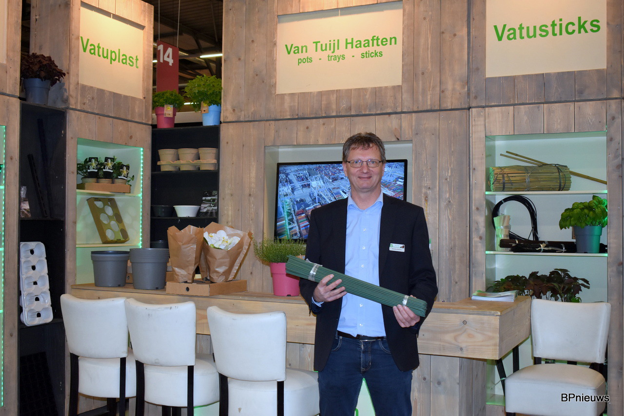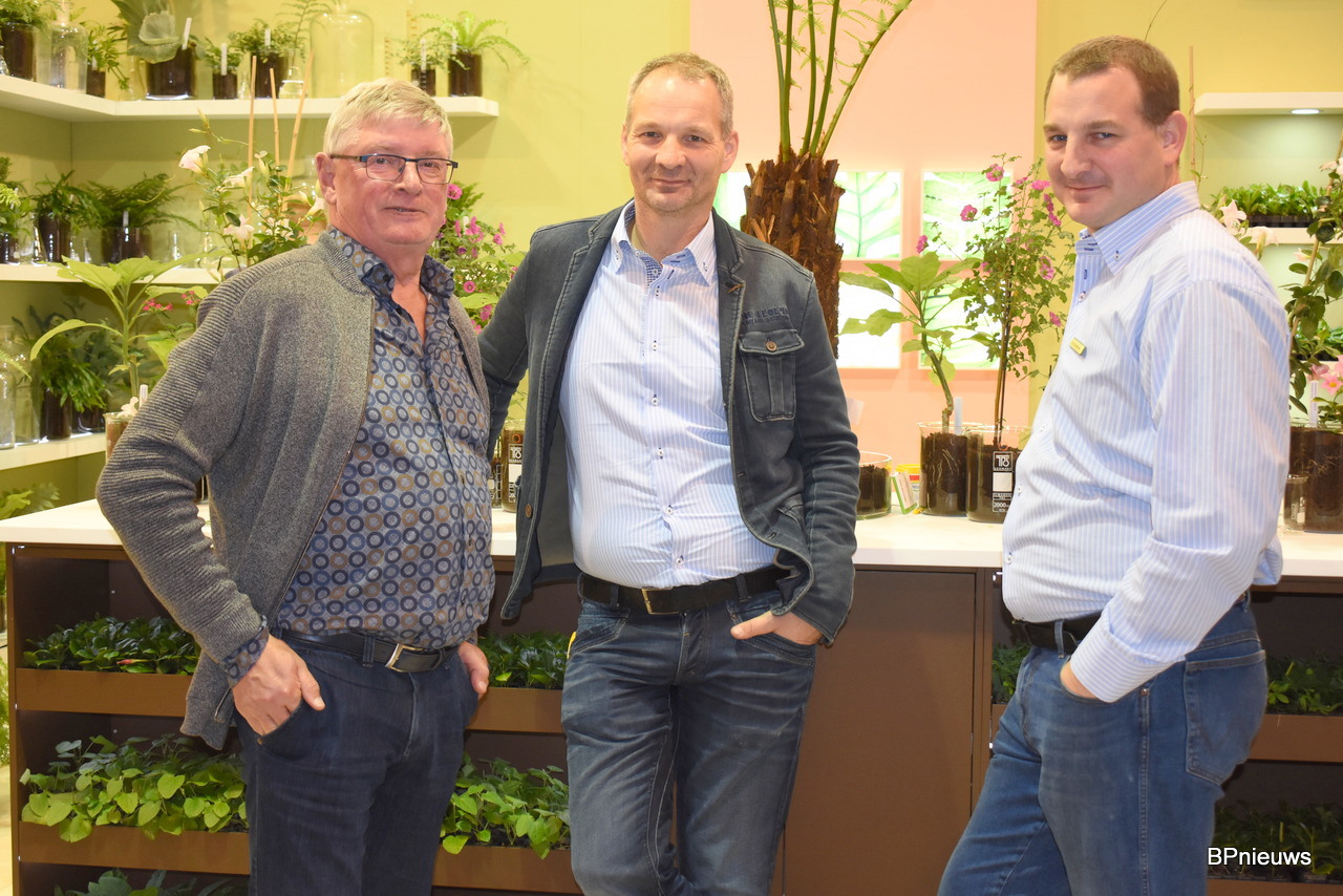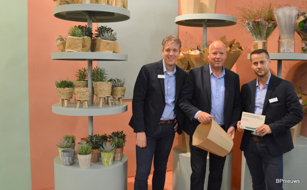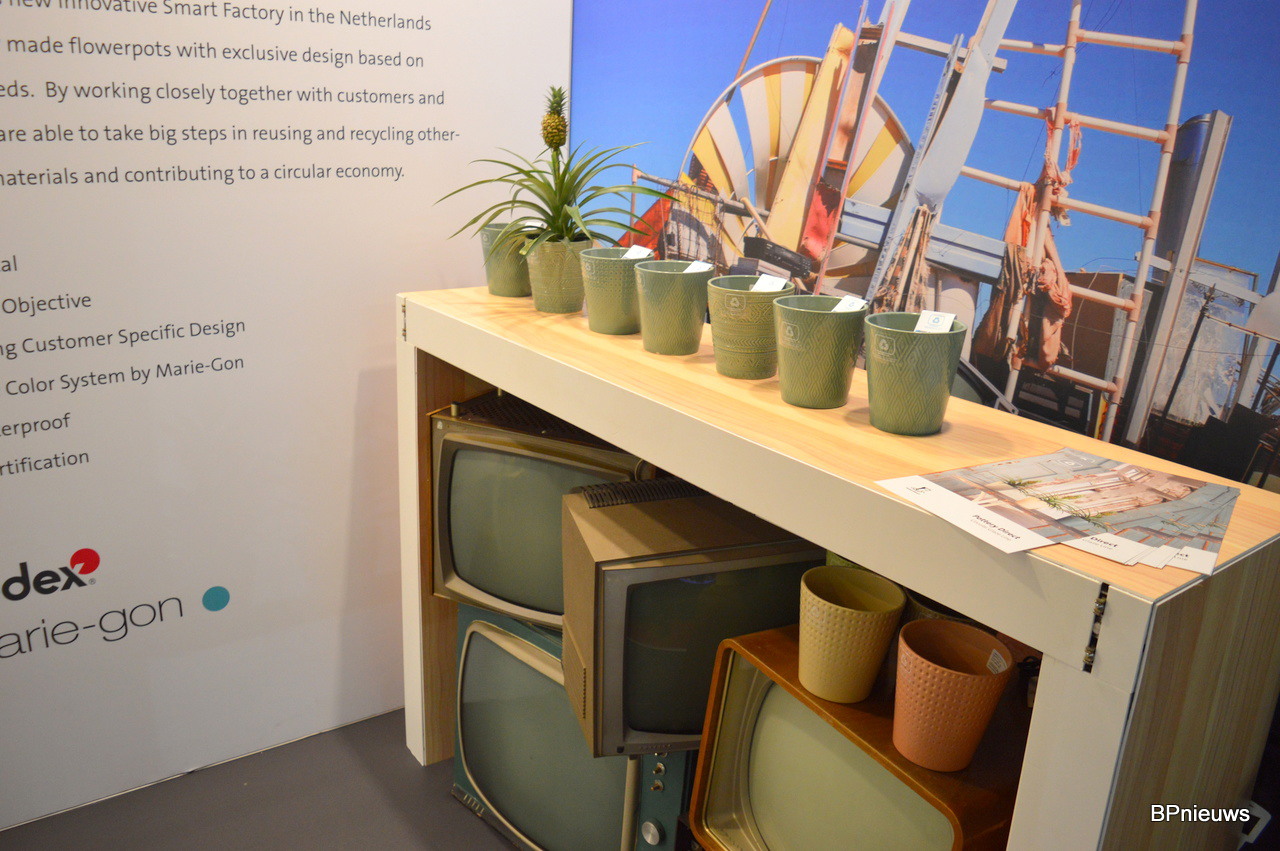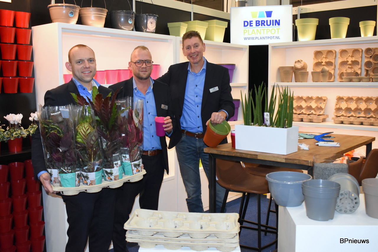 Ook bij de Bruin Plantpot zijn ze bezig met duurzaamheid en dat lieten ze zien door middel van hun nieuwe pulp-tray. Everard de Bruin met de gloednieuwe 8 gaats pulptray. Het is een echte combi tray verteld Everard en door de flexibele klembogen,die in de gaten gevestigd zijn, kun je potten van maat 12 t/m 14 samen in één tray zetten. In het midden staat Gerard van Doeburg met de Lingepot en rechts Ted Verbraeken met hun Terracotta en Olijfgroene potten.