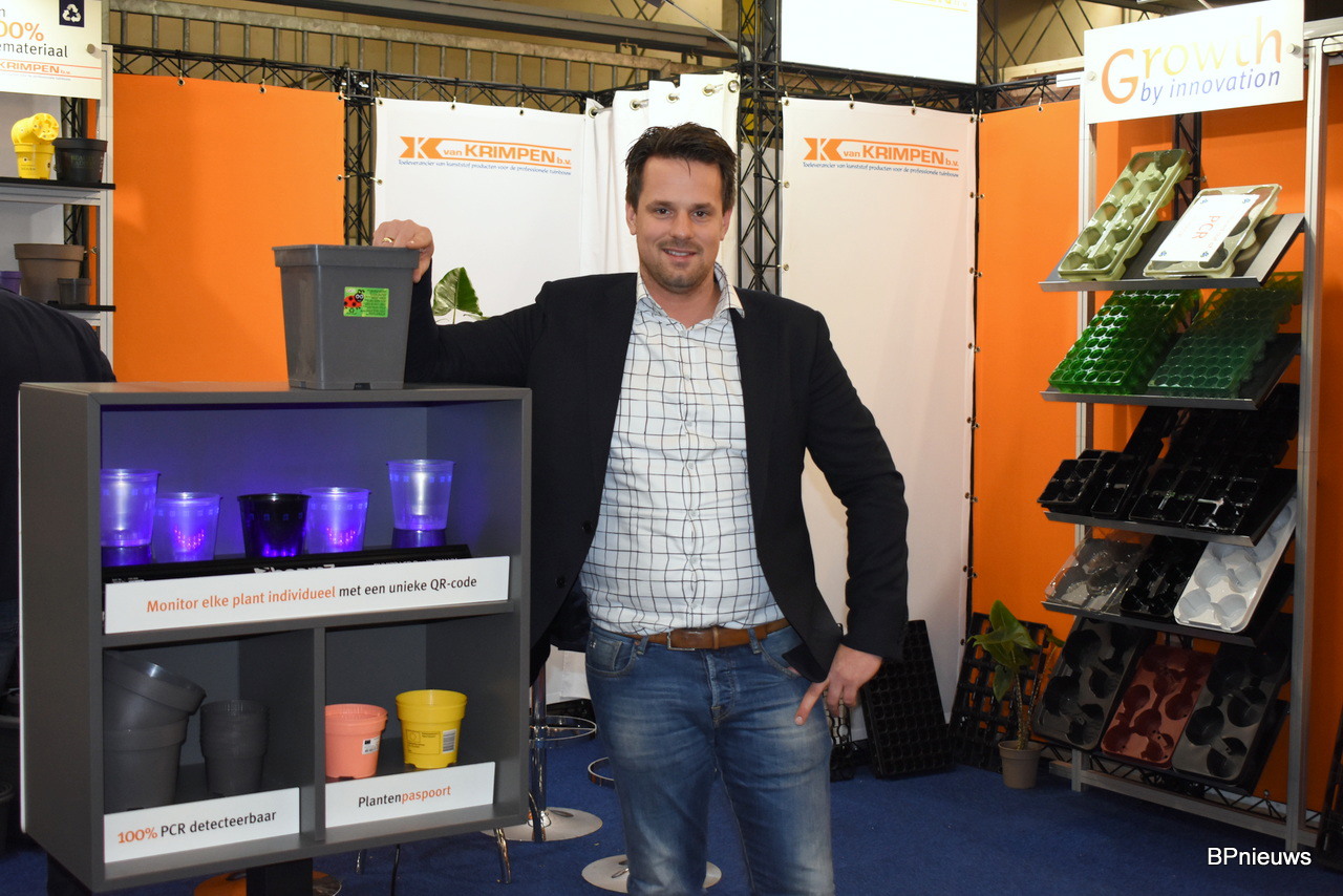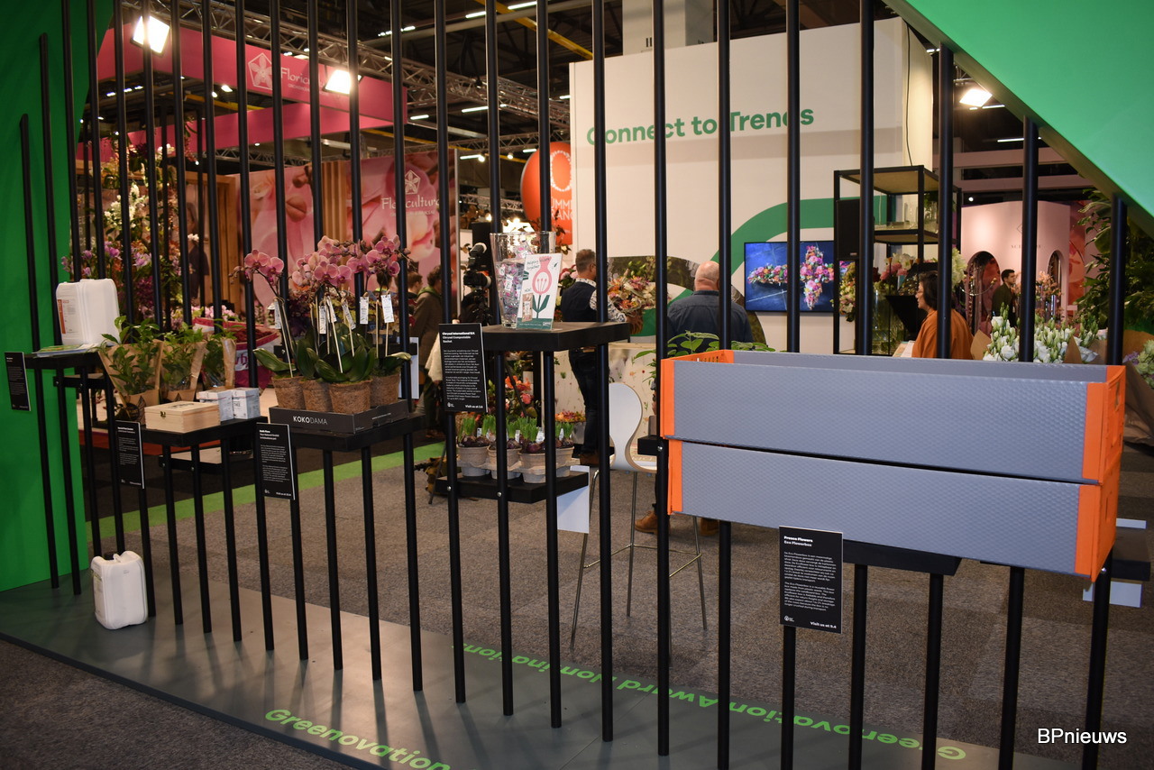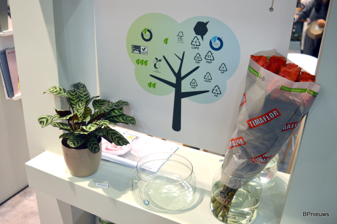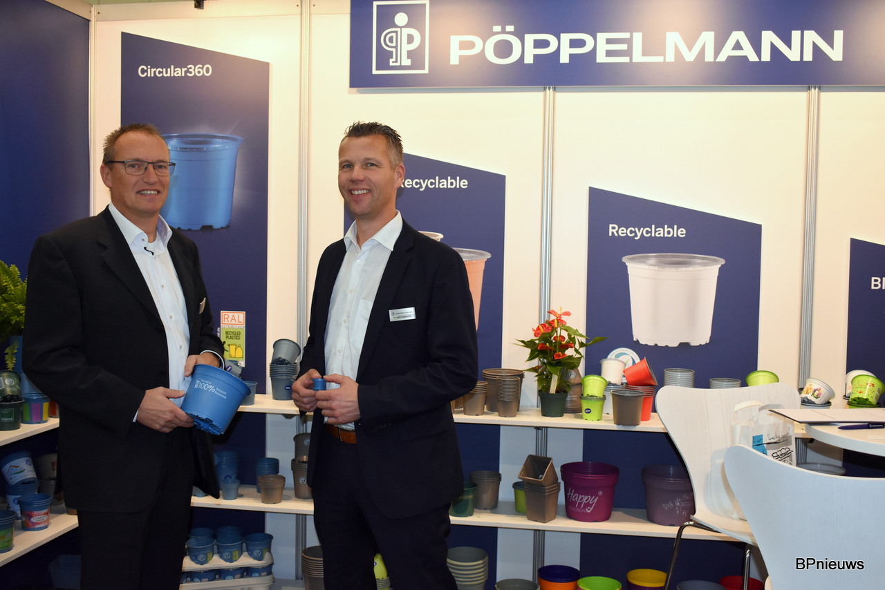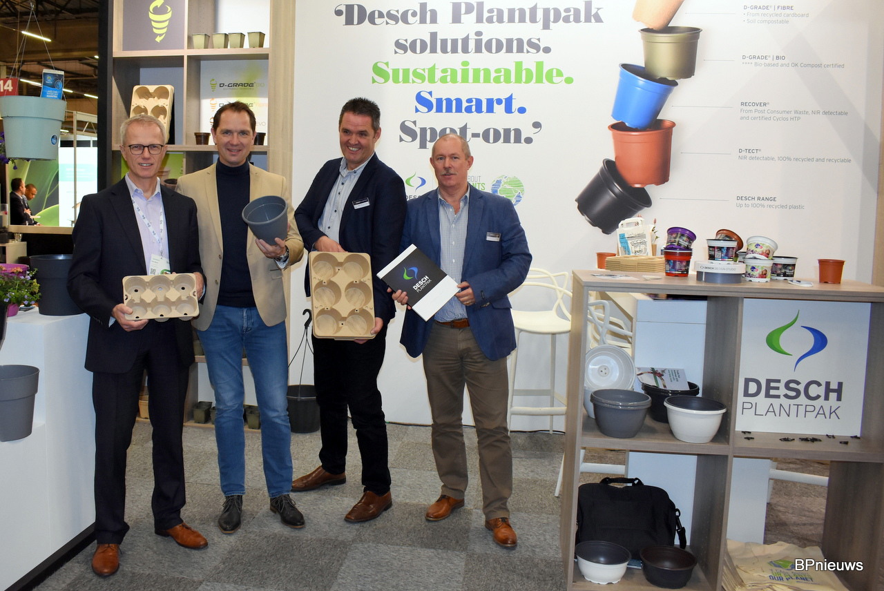 Ook bij de Bruin Plantpot zijn ze bezig met duurzaamheid en dat lieten ze zien door middel van hun nieuwe pulp-tray. Everard de Bruin met de gloednieuwe 8 gaats pulptray. Het is een echte combi tray verteld Everard en door de flexibele klembogen,die in de gaten gevestigd zijn, kun je potten van maat 12 t/m 14 samen in één tray zetten. In het midden staat Gerard van Doeburg met de Lingepot en rechts Ted Verbraeken met hun Terracotta en Olijfgroene potten.