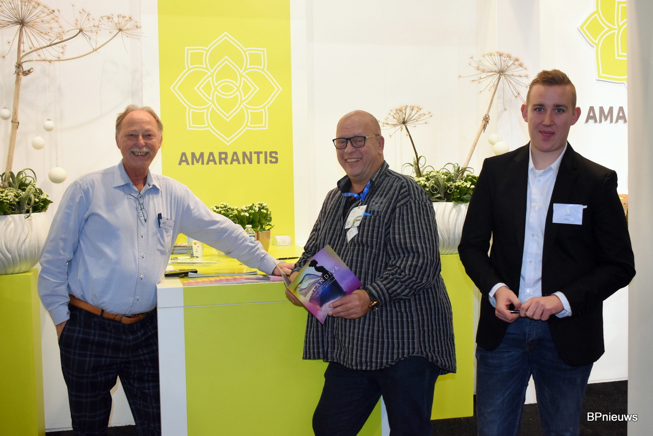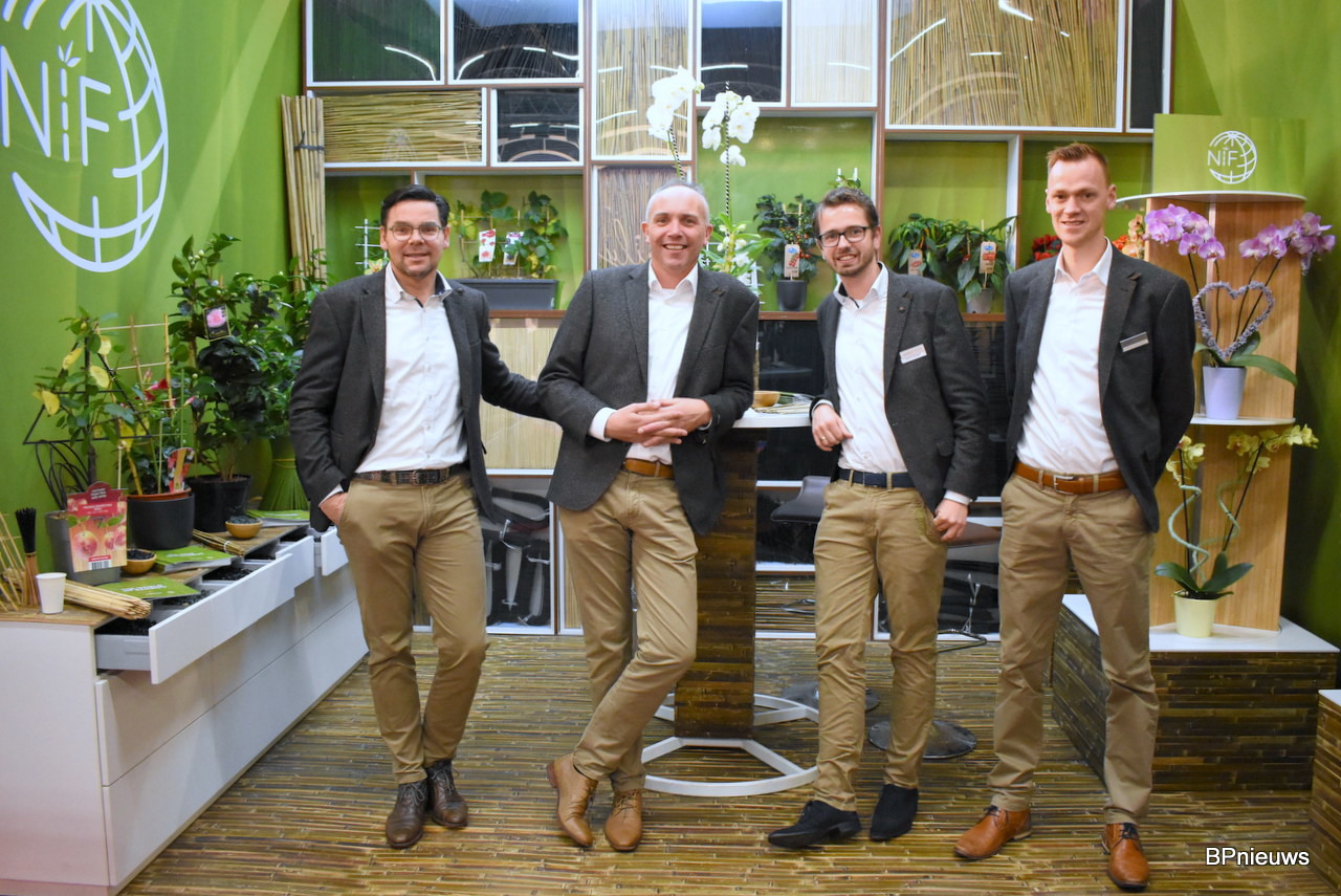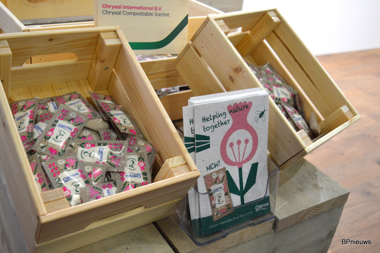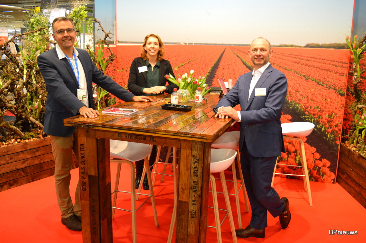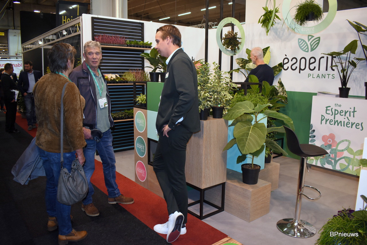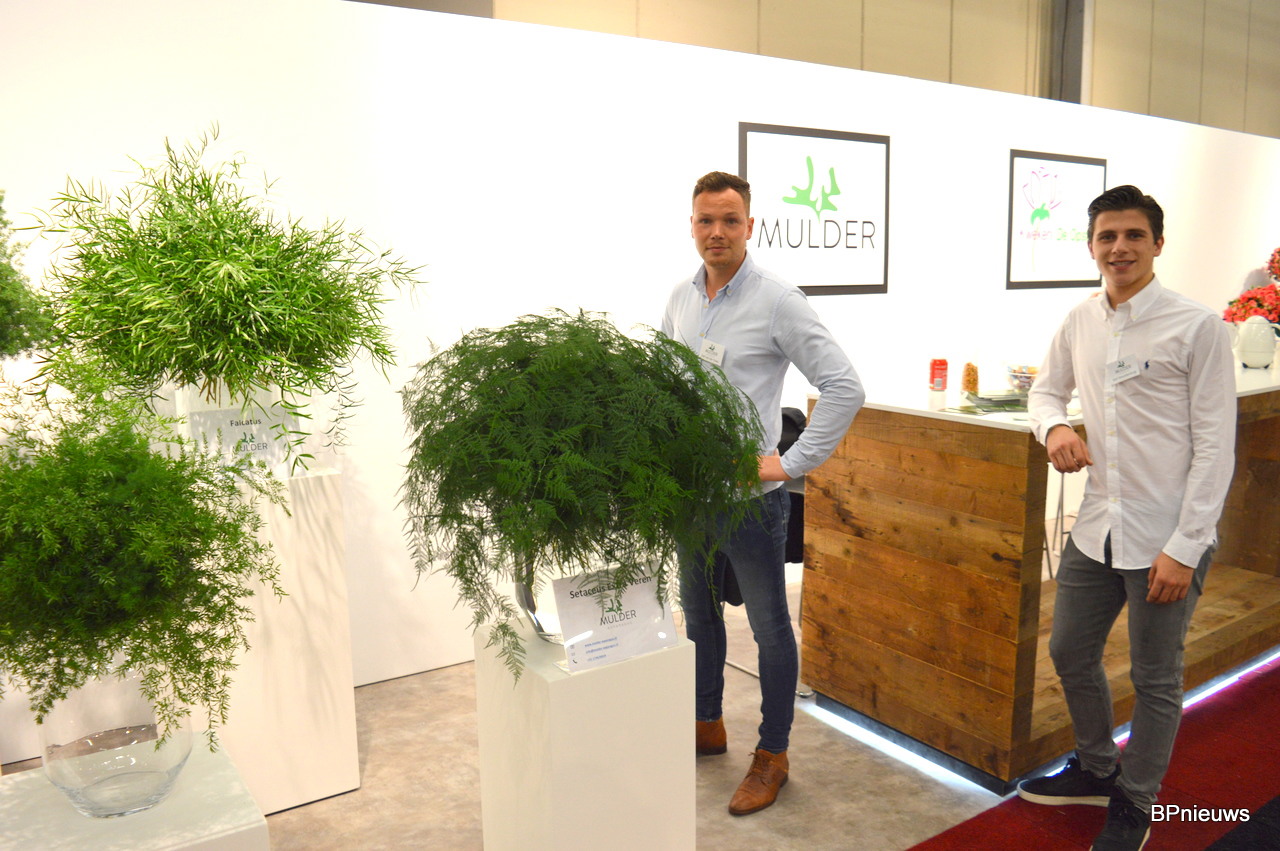 Ook bij de Bruin Plantpot zijn ze bezig met duurzaamheid en dat lieten ze zien door middel van hun nieuwe pulp-tray. Everard de Bruin met de gloednieuwe 8 gaats pulptray. Het is een echte combi tray verteld Everard en door de flexibele klembogen,die in de gaten gevestigd zijn, kun je potten van maat 12 t/m 14 samen in één tray zetten. In het midden staat Gerard van Doeburg met de Lingepot en rechts Ted Verbraeken met hun Terracotta en Olijfgroene potten.