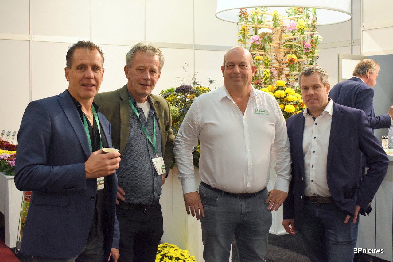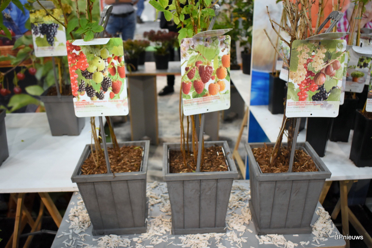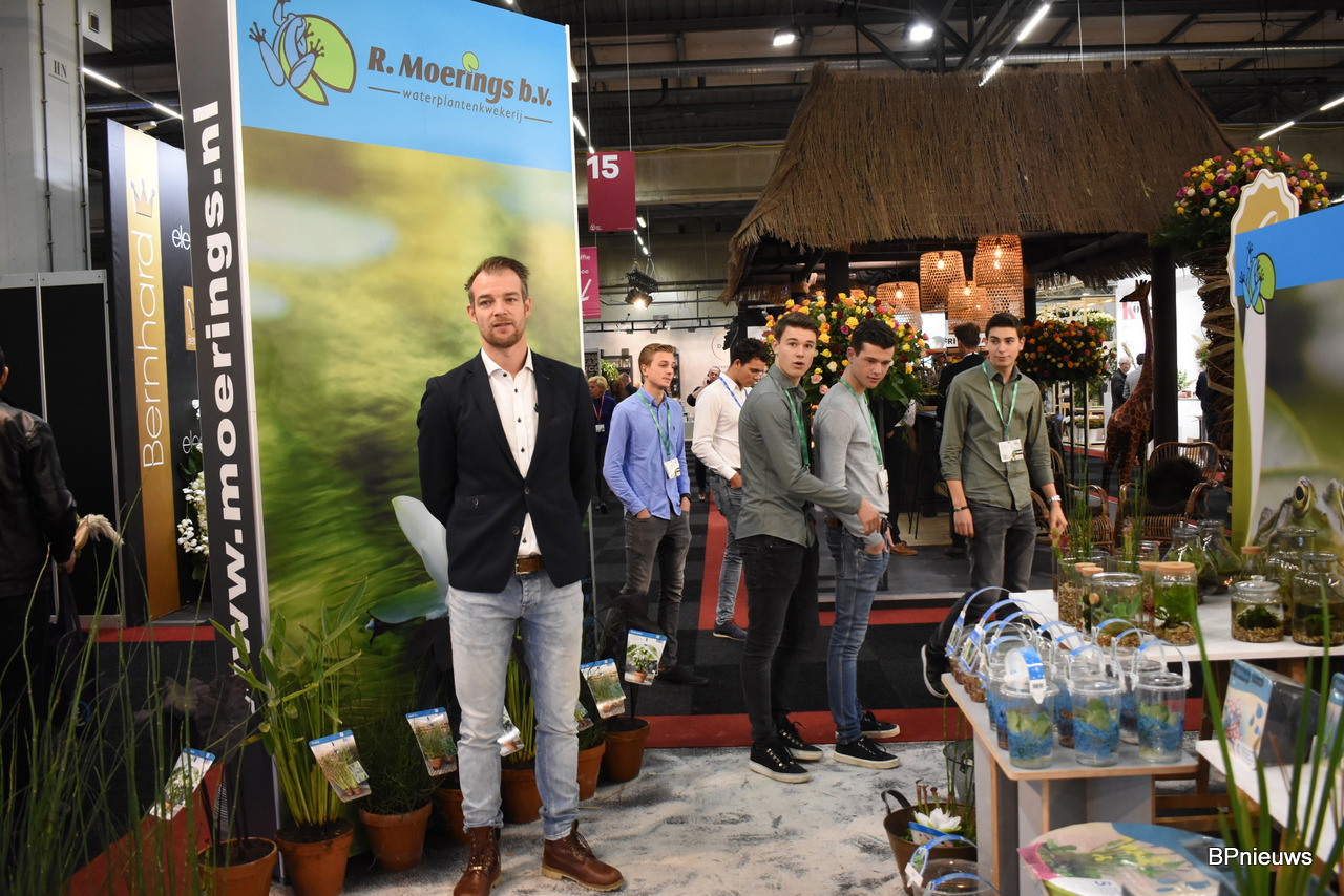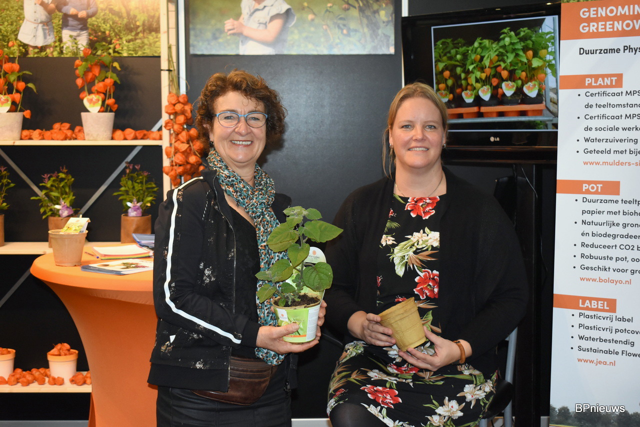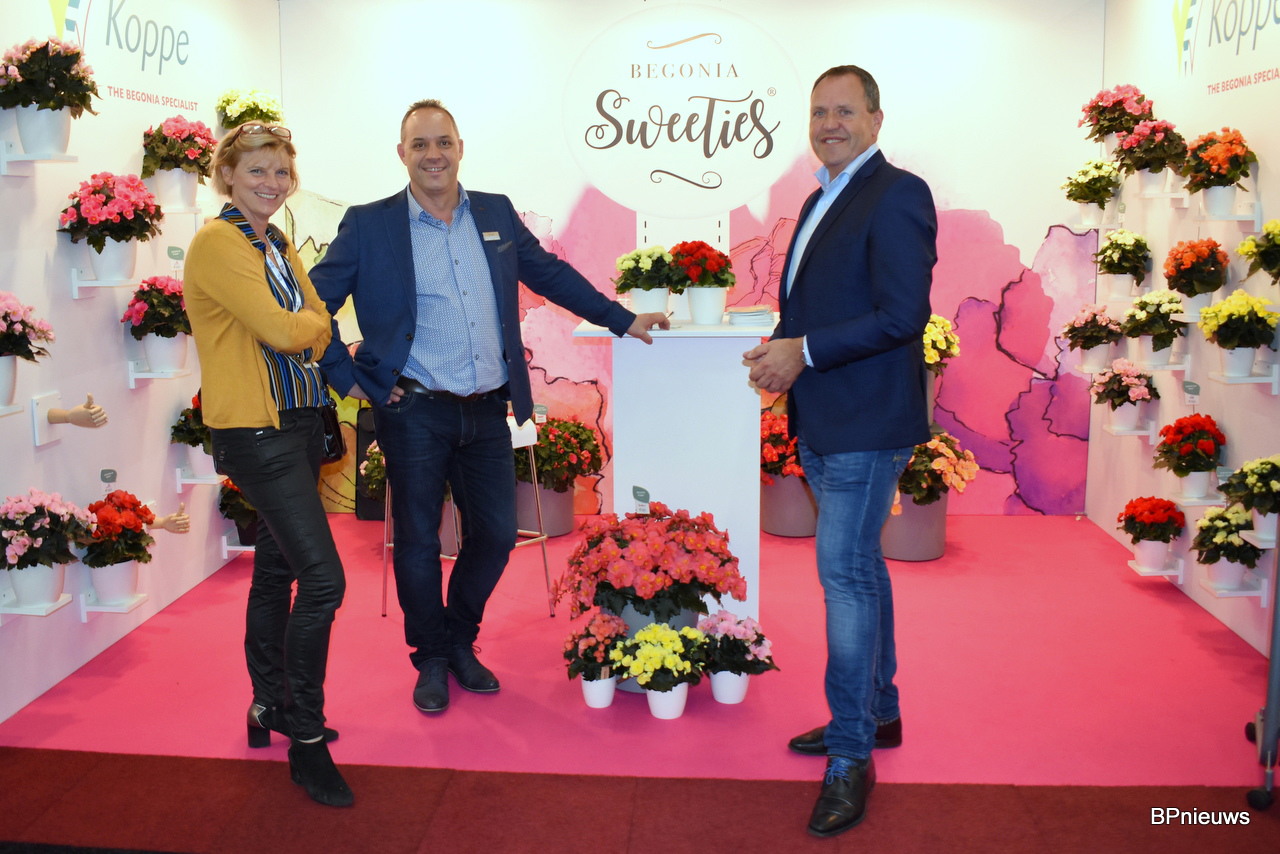 Ook bij de Bruin Plantpot zijn ze bezig met duurzaamheid en dat lieten ze zien door middel van hun nieuwe pulp-tray. Everard de Bruin met de gloednieuwe 8 gaats pulptray. Het is een echte combi tray verteld Everard en door de flexibele klembogen,die in de gaten gevestigd zijn, kun je potten van maat 12 t/m 14 samen in één tray zetten. In het midden staat Gerard van Doeburg met de Lingepot en rechts Ted Verbraeken met hun Terracotta en Olijfgroene potten.