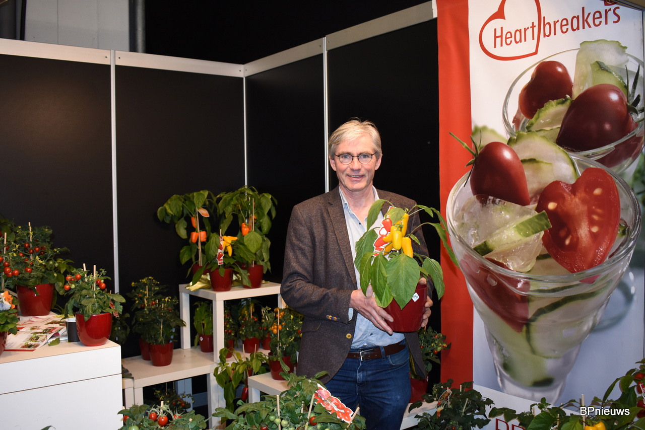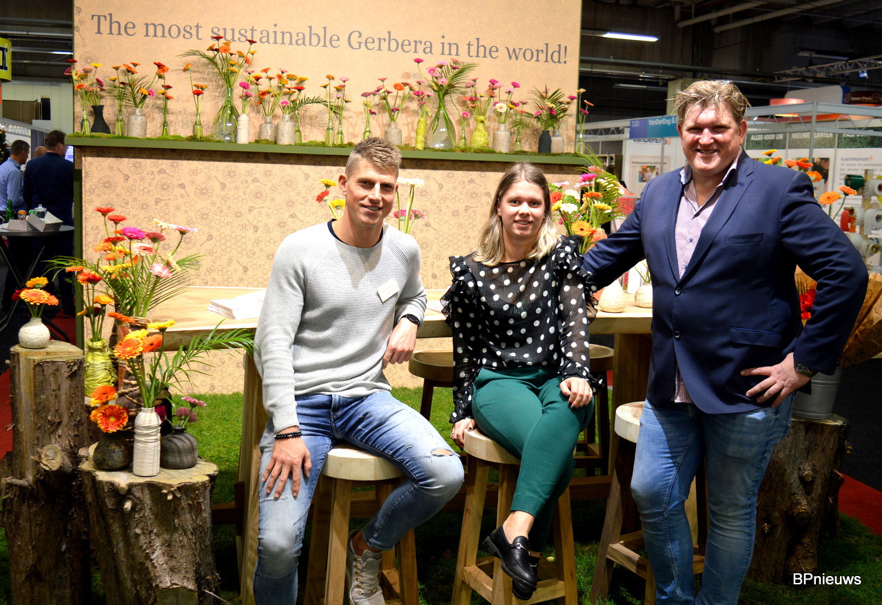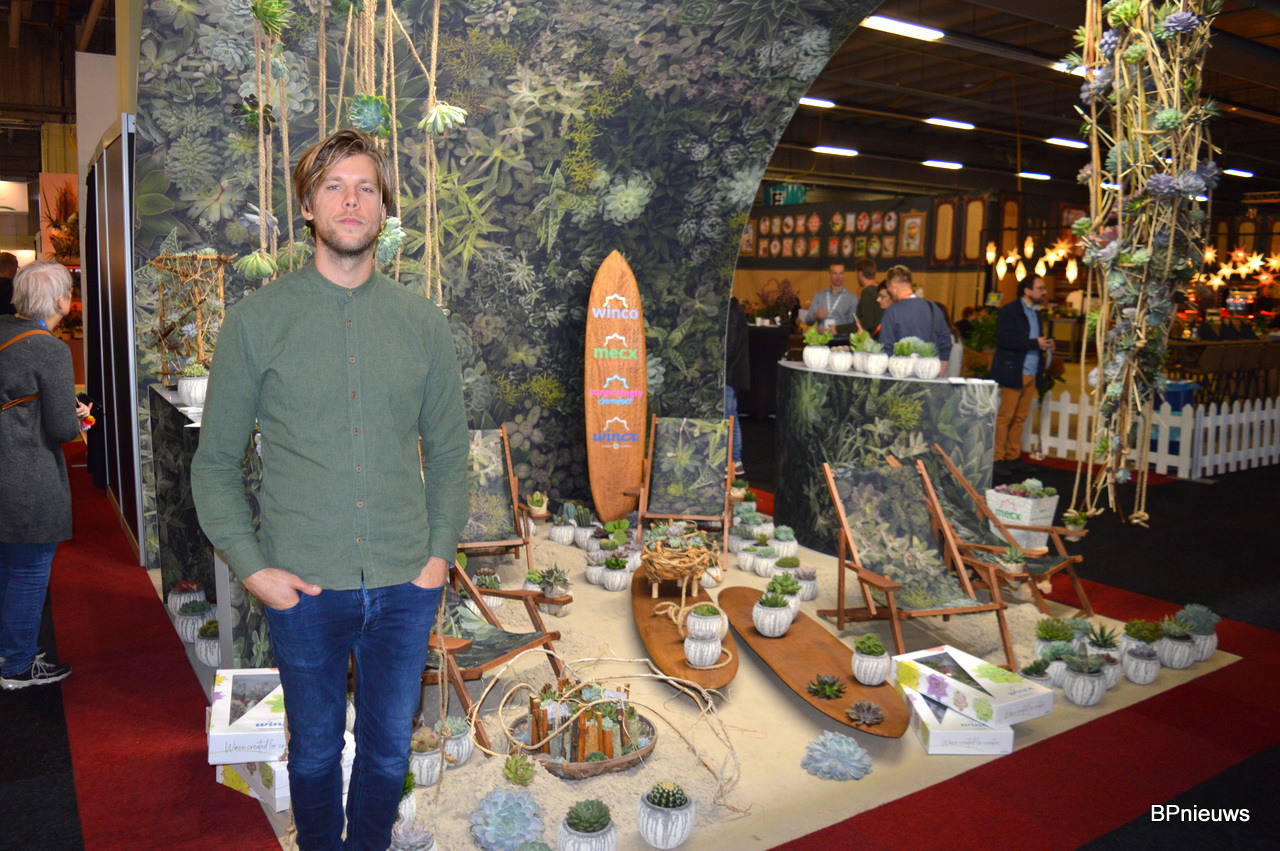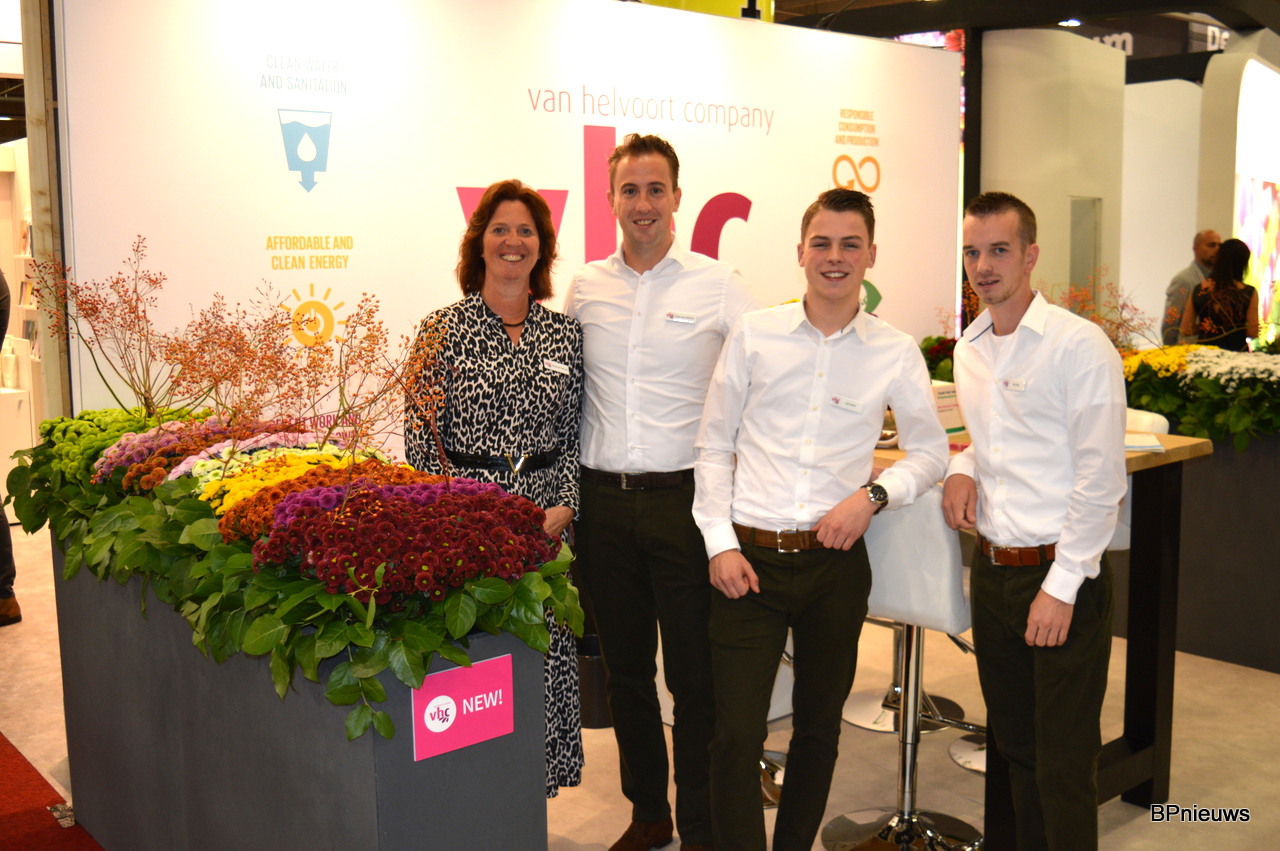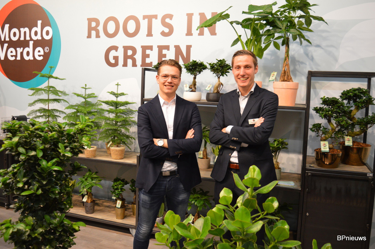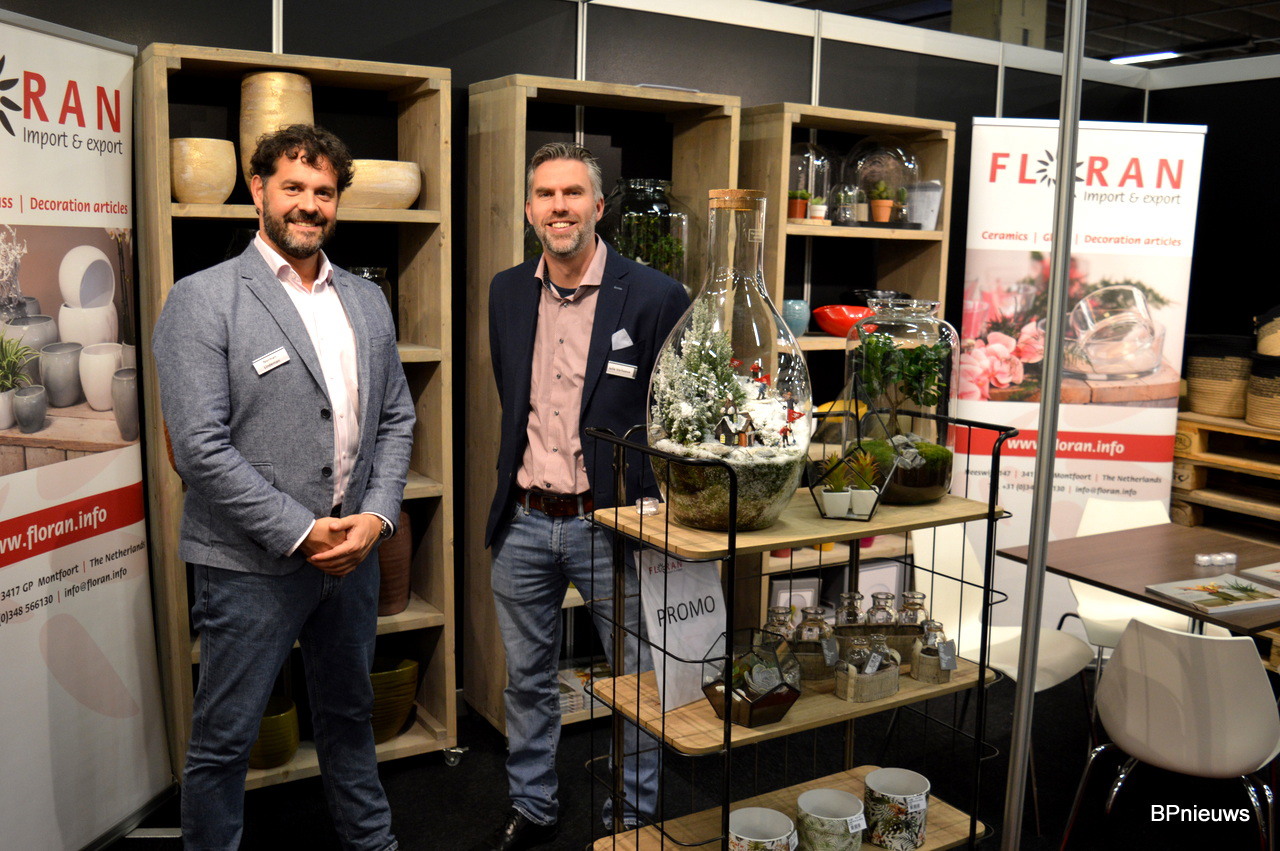 Ook bij de Bruin Plantpot zijn ze bezig met duurzaamheid en dat lieten ze zien door middel van hun nieuwe pulp-tray. Everard de Bruin met de gloednieuwe 8 gaats pulptray. Het is een echte combi tray verteld Everard en door de flexibele klembogen,die in de gaten gevestigd zijn, kun je potten van maat 12 t/m 14 samen in één tray zetten. In het midden staat Gerard van Doeburg met de Lingepot en rechts Ted Verbraeken met hun Terracotta en Olijfgroene potten.