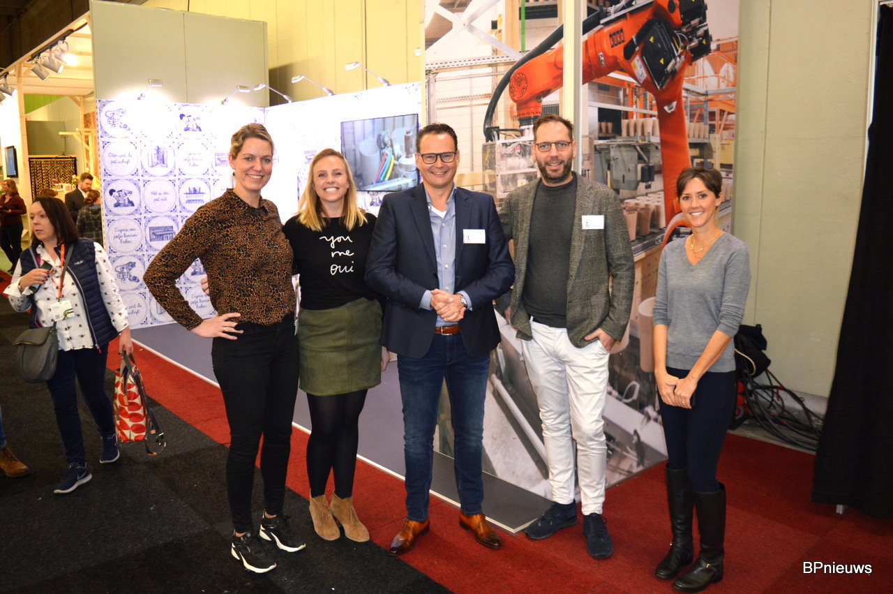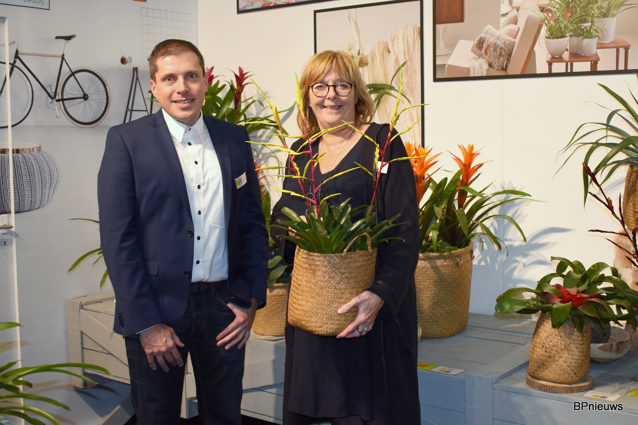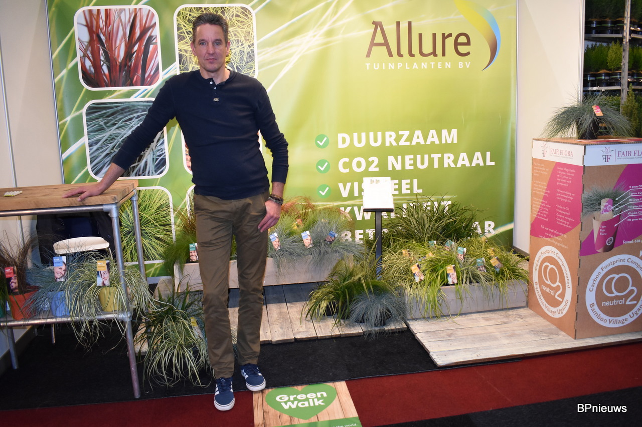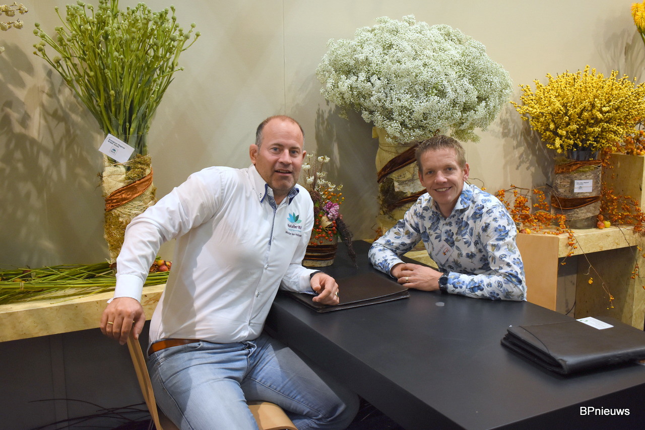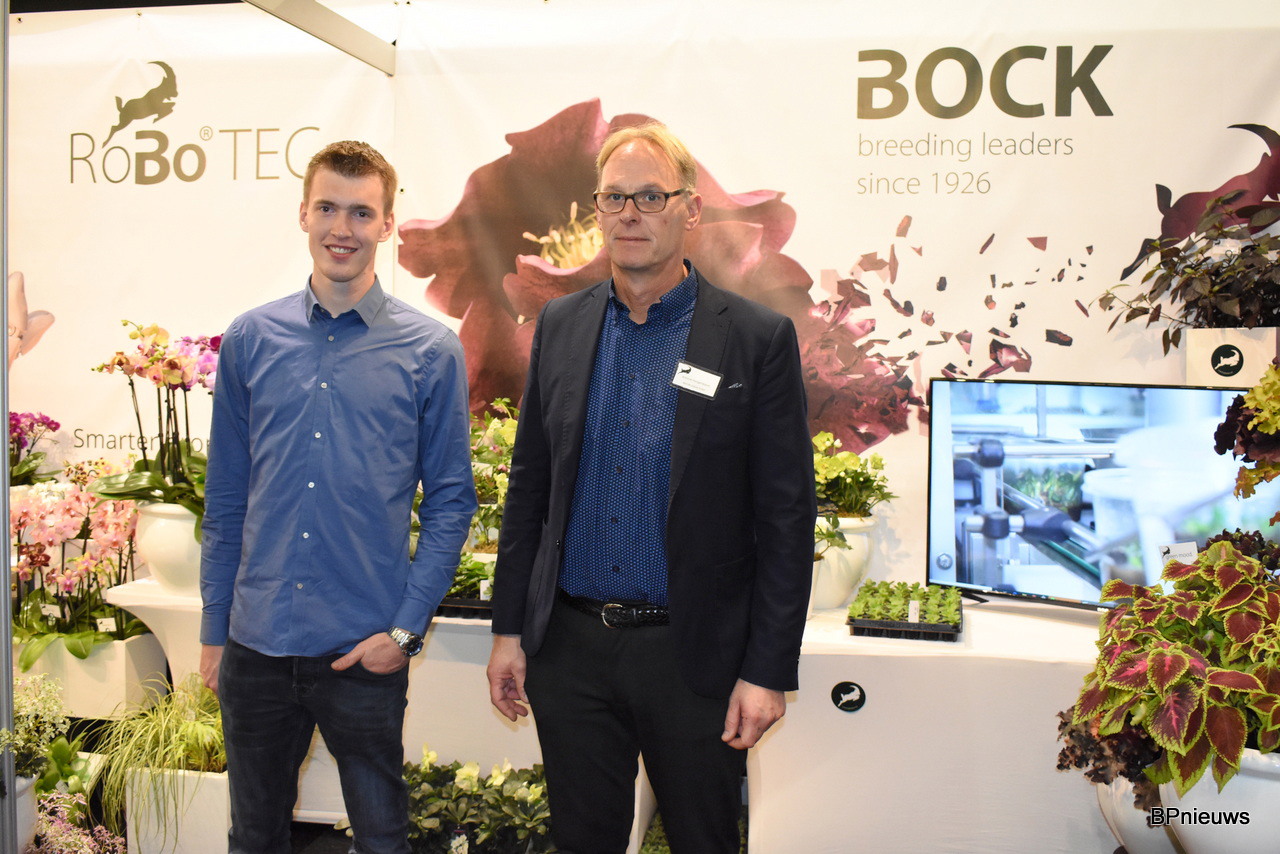 Ook bij de Bruin Plantpot zijn ze bezig met duurzaamheid en dat lieten ze zien door middel van hun nieuwe pulp-tray. Everard de Bruin met de gloednieuwe 8 gaats pulptray. Het is een echte combi tray verteld Everard en door de flexibele klembogen,die in de gaten gevestigd zijn, kun je potten van maat 12 t/m 14 samen in één tray zetten. In het midden staat Gerard van Doeburg met de Lingepot en rechts Ted Verbraeken met hun Terracotta en Olijfgroene potten.