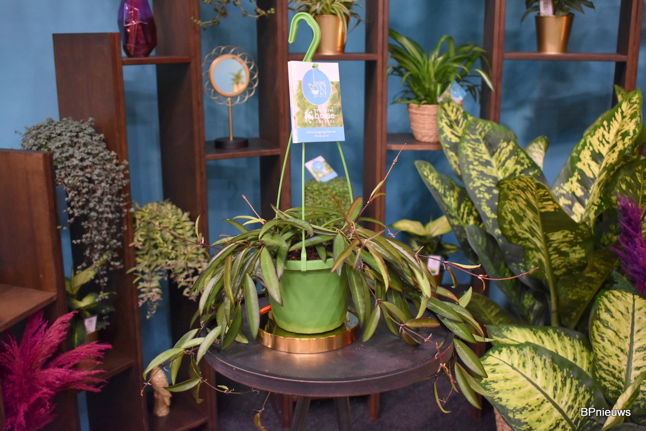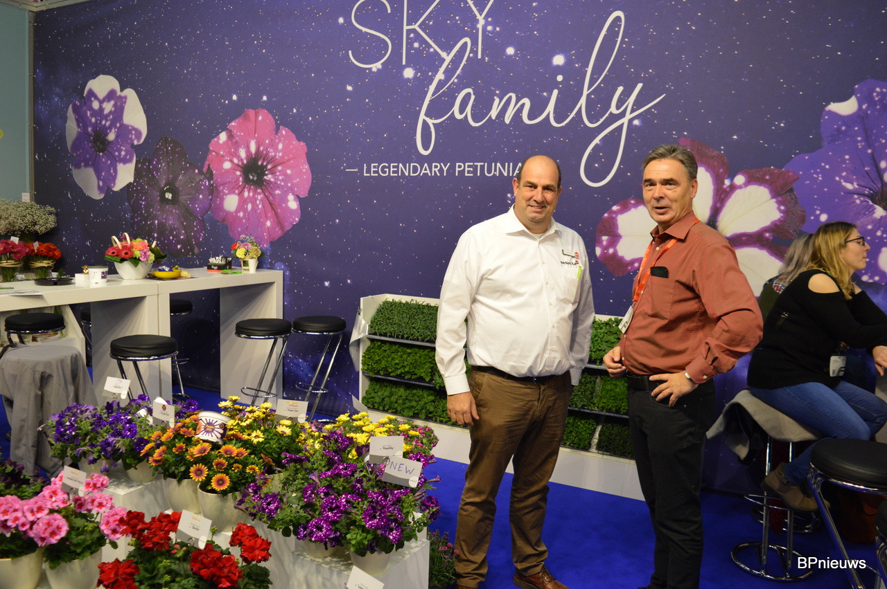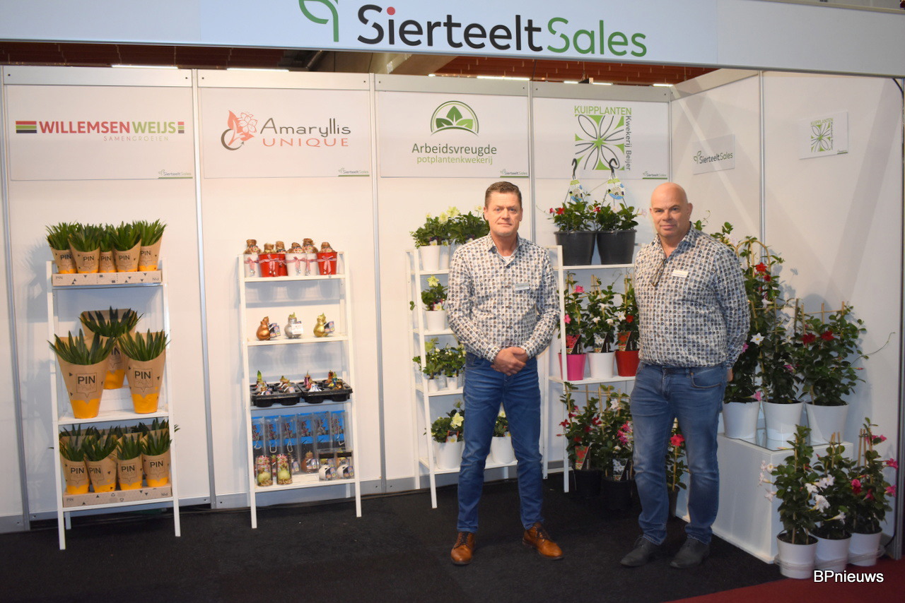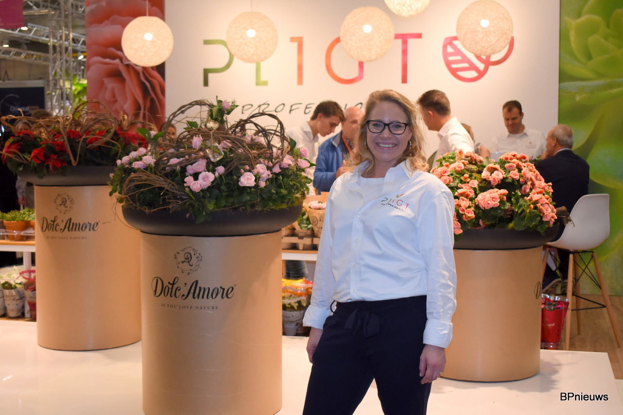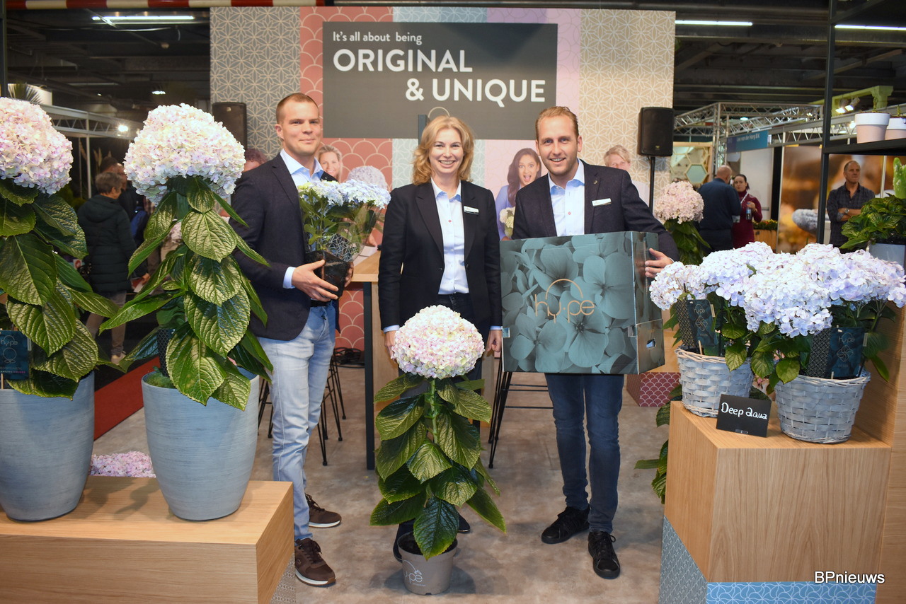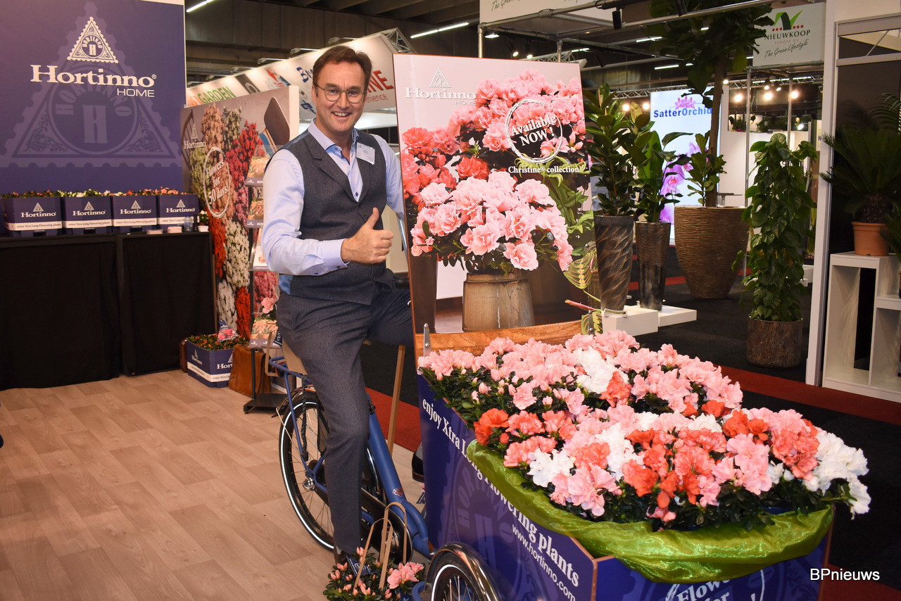 Ook bij de Bruin Plantpot zijn ze bezig met duurzaamheid en dat lieten ze zien door middel van hun nieuwe pulp-tray. Everard de Bruin met de gloednieuwe 8 gaats pulptray. Het is een echte combi tray verteld Everard en door de flexibele klembogen,die in de gaten gevestigd zijn, kun je potten van maat 12 t/m 14 samen in één tray zetten. In het midden staat Gerard van Doeburg met de Lingepot en rechts Ted Verbraeken met hun Terracotta en Olijfgroene potten.