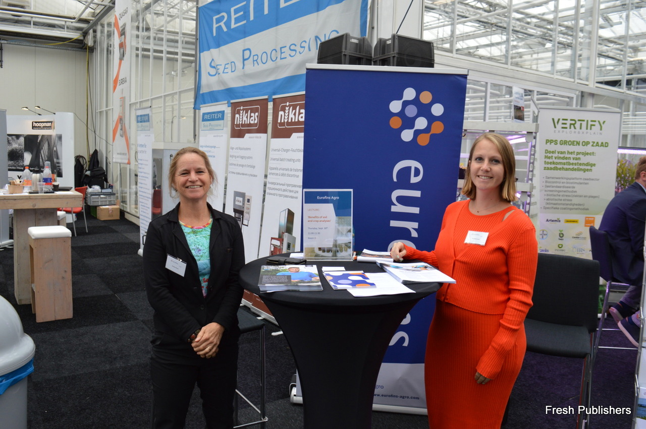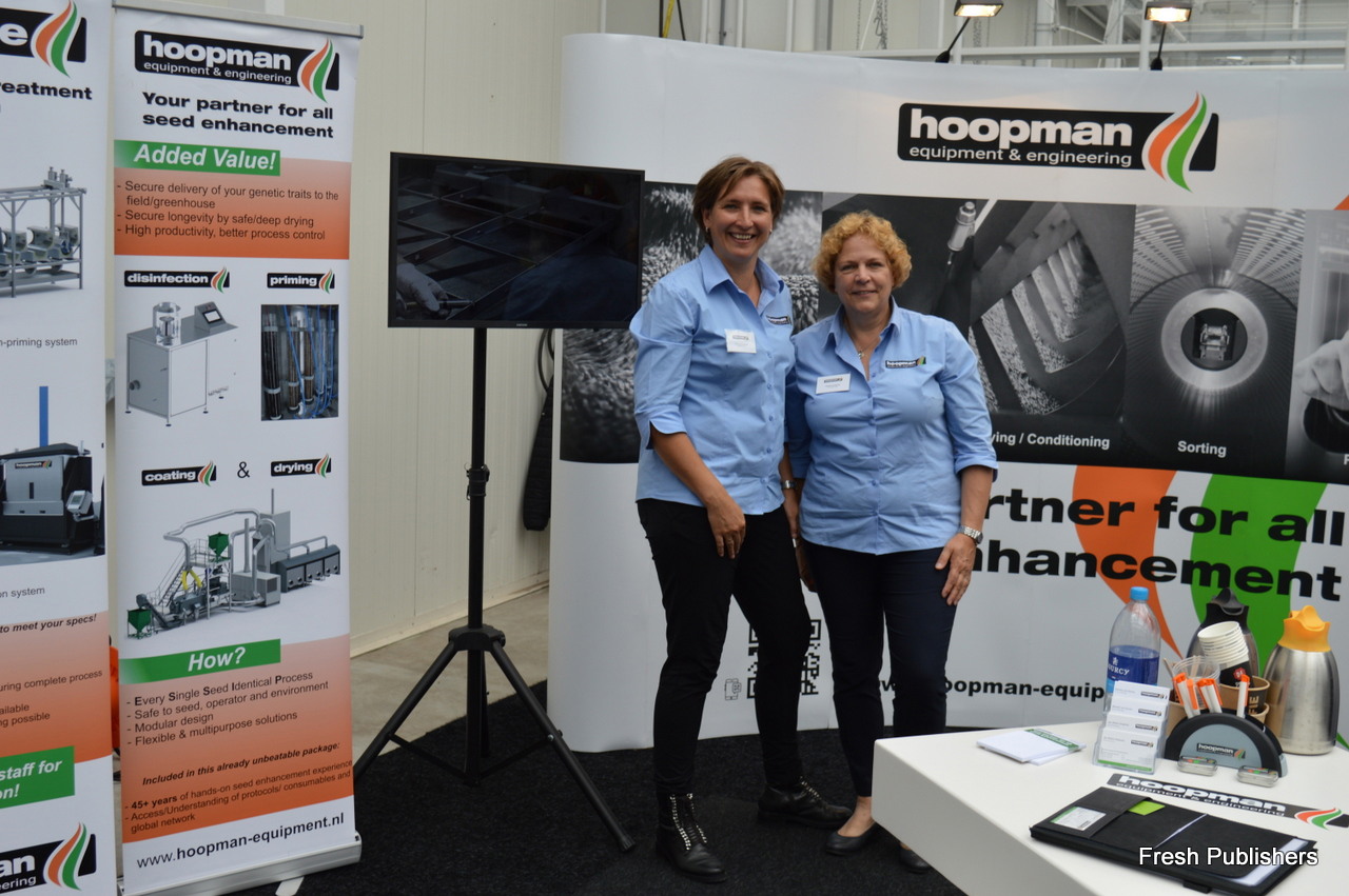 Willem van Dok with Seed Processing Holland, with on the left Melanie Klein greating a visitor to the booth.