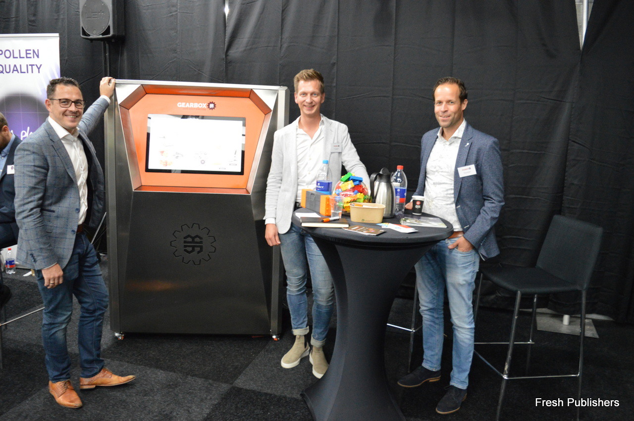 Martin de Deyne, Ab van Staalduinen en Harm van Adrichem with Gerabox. Visitors guessing the amount of lego building blocks in the glass vase get to use the Gear Sense crop-camera one year for free.