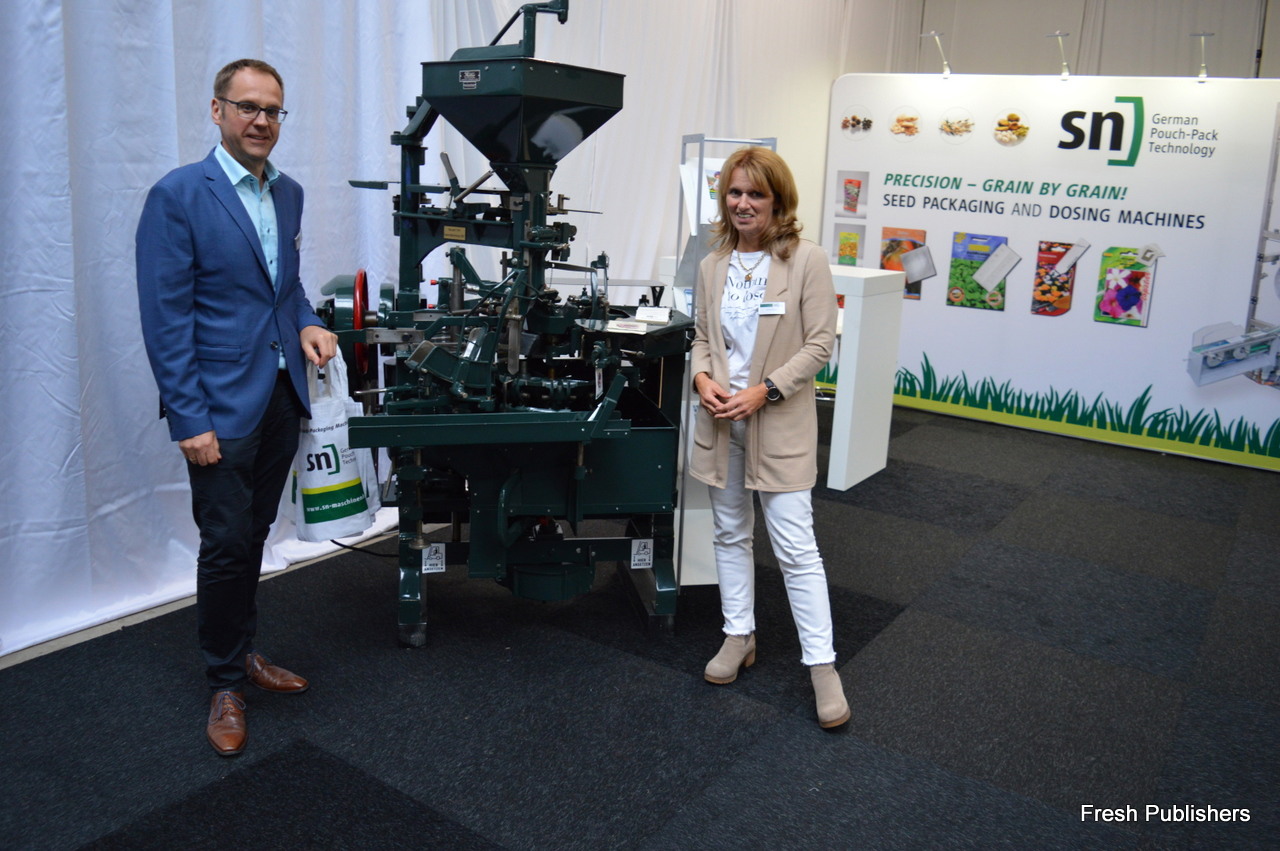 This machine filling pockets with seed is developed by SN Machinenbau, is 80 years old and is still in use by different customers all over the world. At the fair the company was represented by Dirk Münigersdorf and Ulrike Michel.