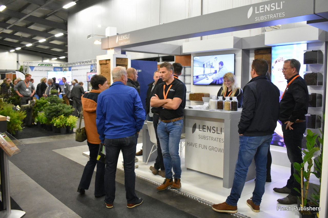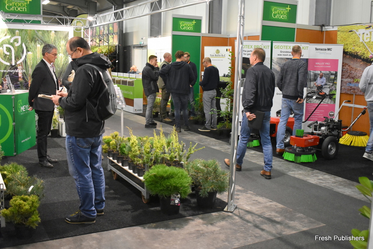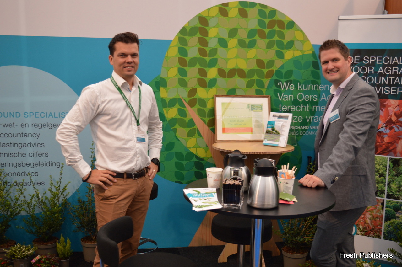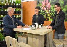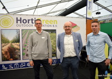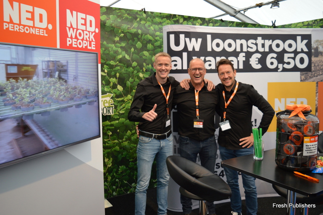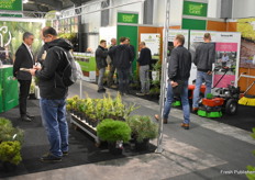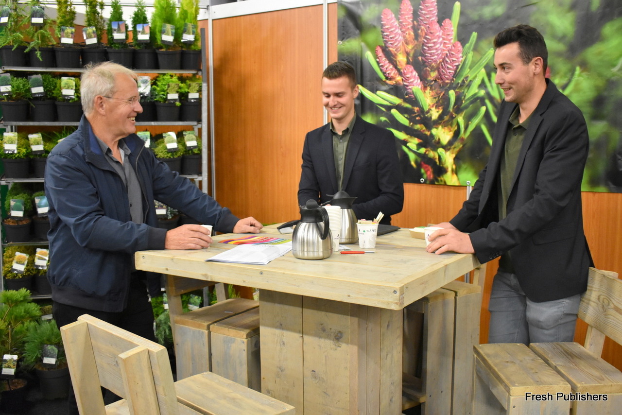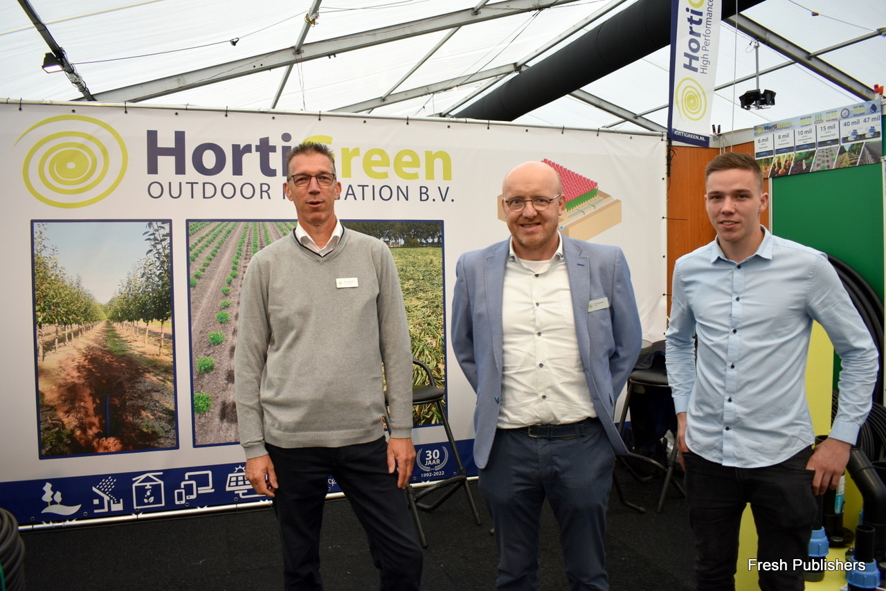 De stand van Broere Beregening wordt bemand door (van links naar recht) John Duijvestijn, Arie-Jan Broere en Ties Baltussen. Broere Beregening heeft meerder oplossingen voor vollegrondteelt, boomkwekerijen, zachtfruittelers en druppelinstallaties.